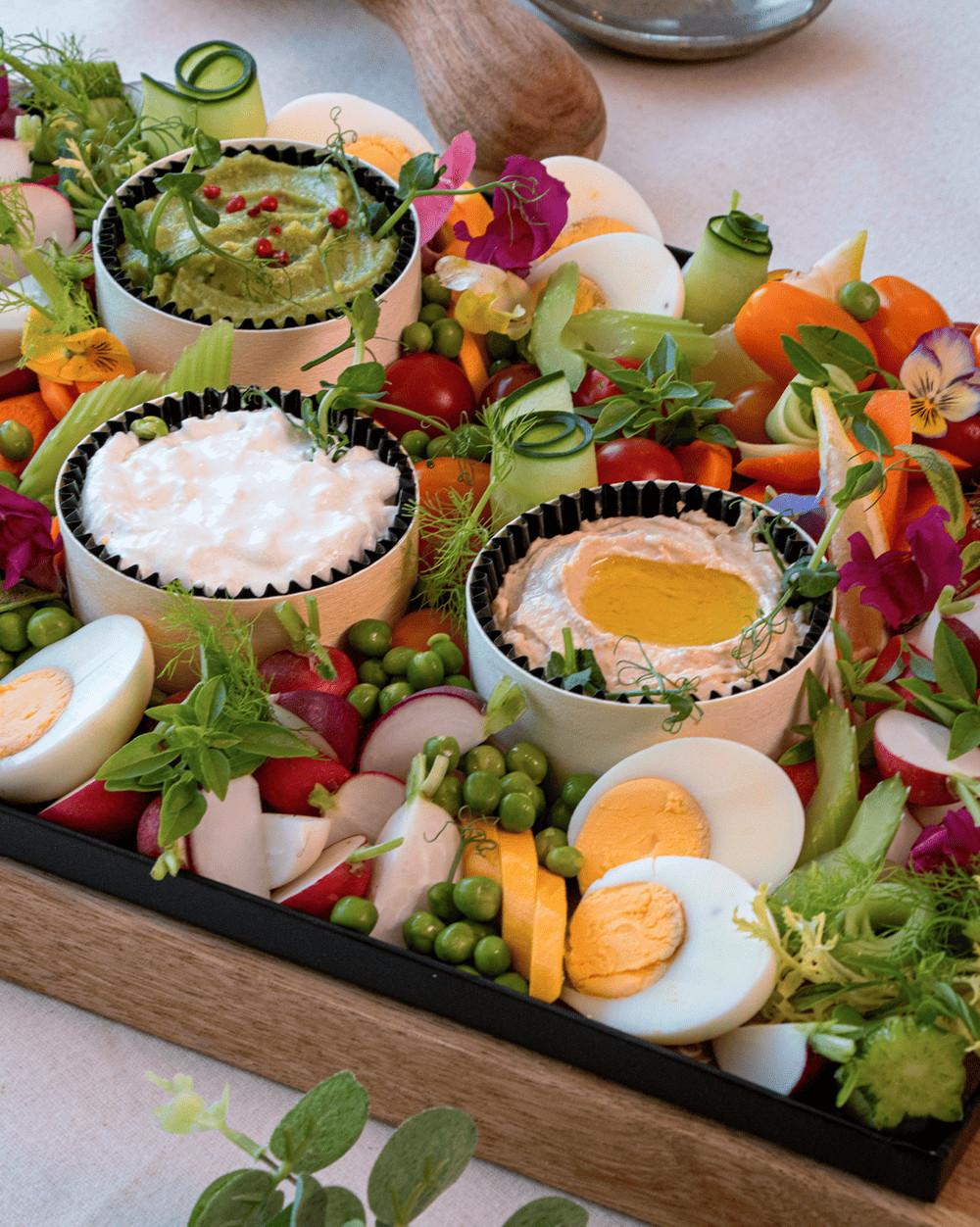 Œufs durs, radis multicolores, tomates cerises, carottes, courgettes, houmous, guacamole, burrata et crackers