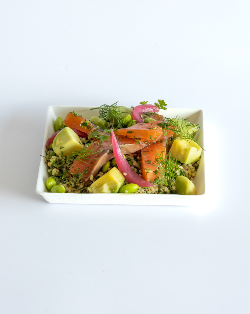 - Homemade gravlax salmon with a mixed grain blend (wheat, lentils, spelt, flax, sunflower), avocado, and edamame