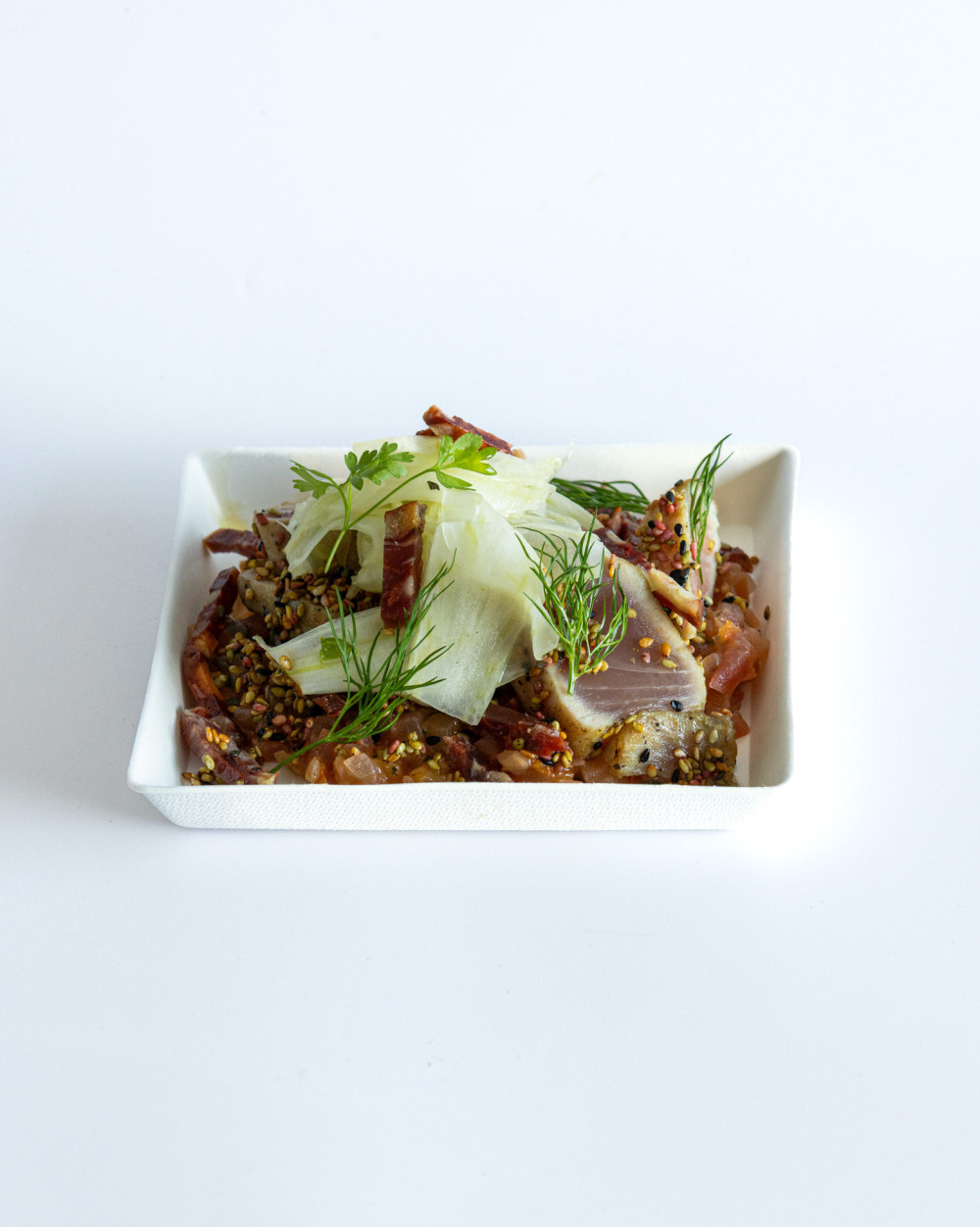 - Seared Red Tuna with Seven Sesame Seeds, Tomato Tartare with Iberian Chorizo, Thinly Sliced Fennel